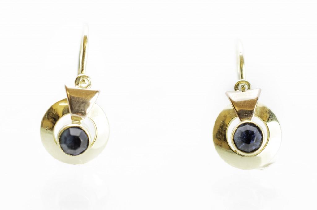 Zlaté náušnice o ryzosti 585/1000, punc čejka, váha 1,42g, výška celkem 16 mm. Kámen je syntetický.