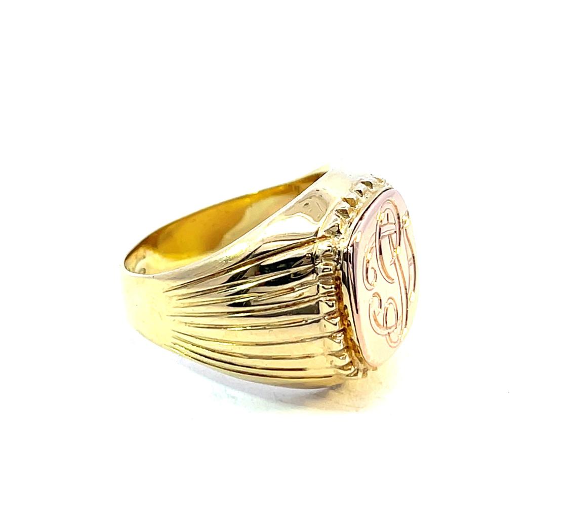 Prsten z kombinace žlutého a růžového zlata o ryzosti 585/1000, punc čejka. Velikost 60, váha 10,69 g, v nejširším bodě 18 mm.