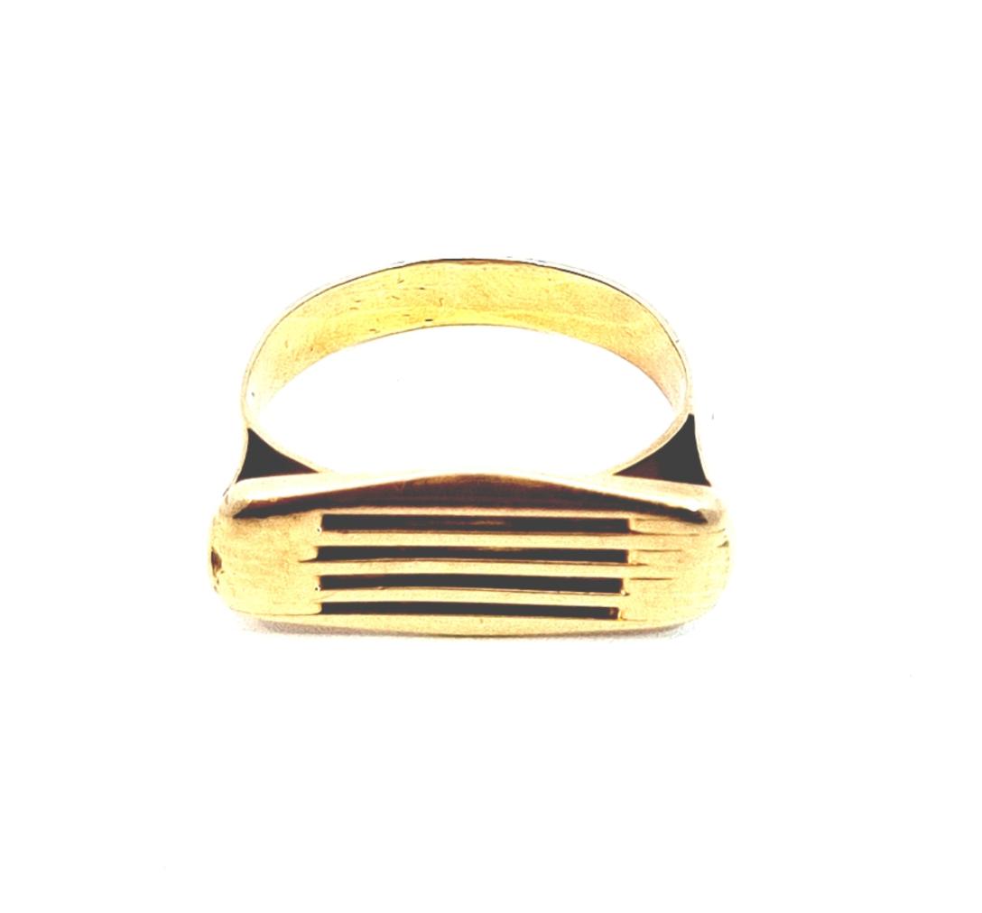 Zlatý prsten o ryzosti 585/1000, punc labuť. Velikost 61, váha 5,23 g, v nejširším bodě 9 mm.