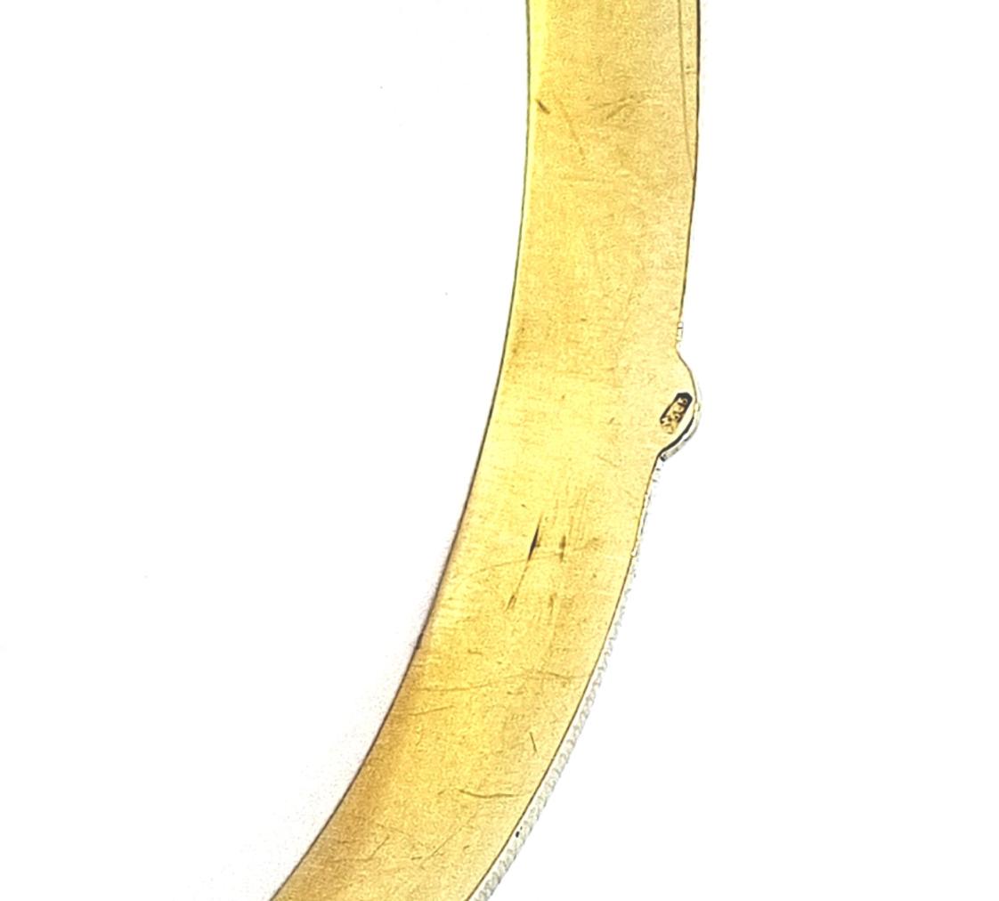 Zlatý náramek o ryzosti 585/1000, punc labuť. Váha 10,83 g, průměr 66 mm, v nejširším bodě 8 mm. Na jednom místě je lehké promáčknutí.