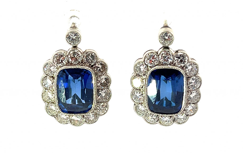 Nádherné starožitné náušnice z bílého zlata s diamanty a velkými syntetickými safíry. Ryzost 585/1000 punc lvíček. Váha 5,17 g. Celková výška je 18 mm, šířka 13 mm. Rozměry safírů jsou 8,7 x 7 x 4,3/4,4 mm. Čiré kameny jsou přírodní diamanty - 30 ks a mají dohromady cca 1,65 ct. K dispozici odborný posudek viz. foto.