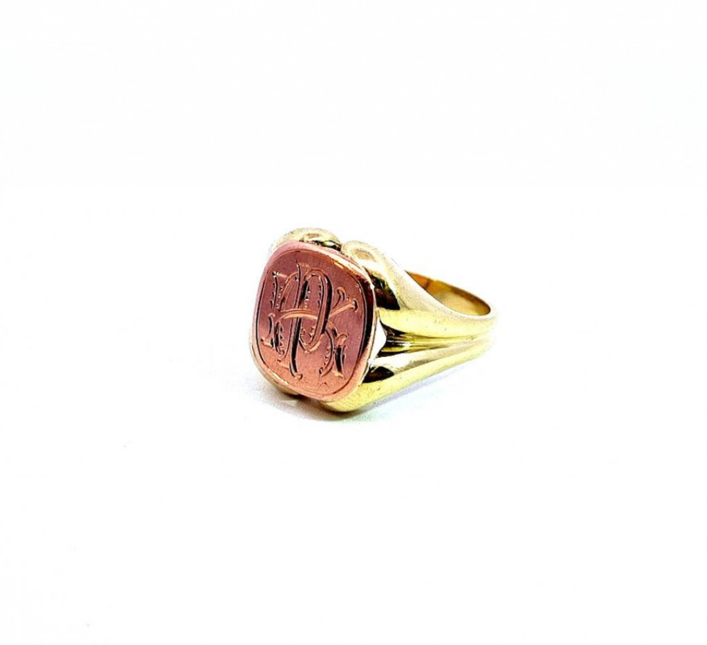 Prsten z kombinace žlutého a růžového zlata o ryzosti 585/1000, punc lvíček. Velikost 61, váha 11,89 g, rozměr hlavy prstenu 16 x 19 mm. Prsten zdobí monogram KP.
