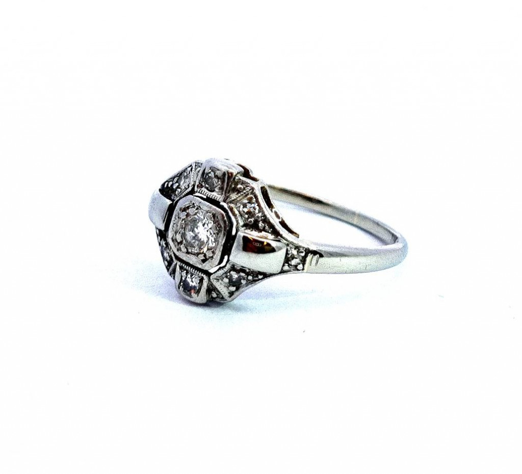 Prsten z bílého zlata o ryzosti 585/1000, punc lvíček. Velikost 53, váha 2,84 g, rozměr hlavy prstenu 11 x 15 mm. Kámen - přírodní diamant briliantového brusu - celkem 7 ks, centrální kámen: 1 ks, cca 0,10 ct, menší kameny: 2 ks, cca 0,04 ct, ostatní kameny: 4 ks, cca 0,005 ct. Dohromady cca 0,20 ct.
