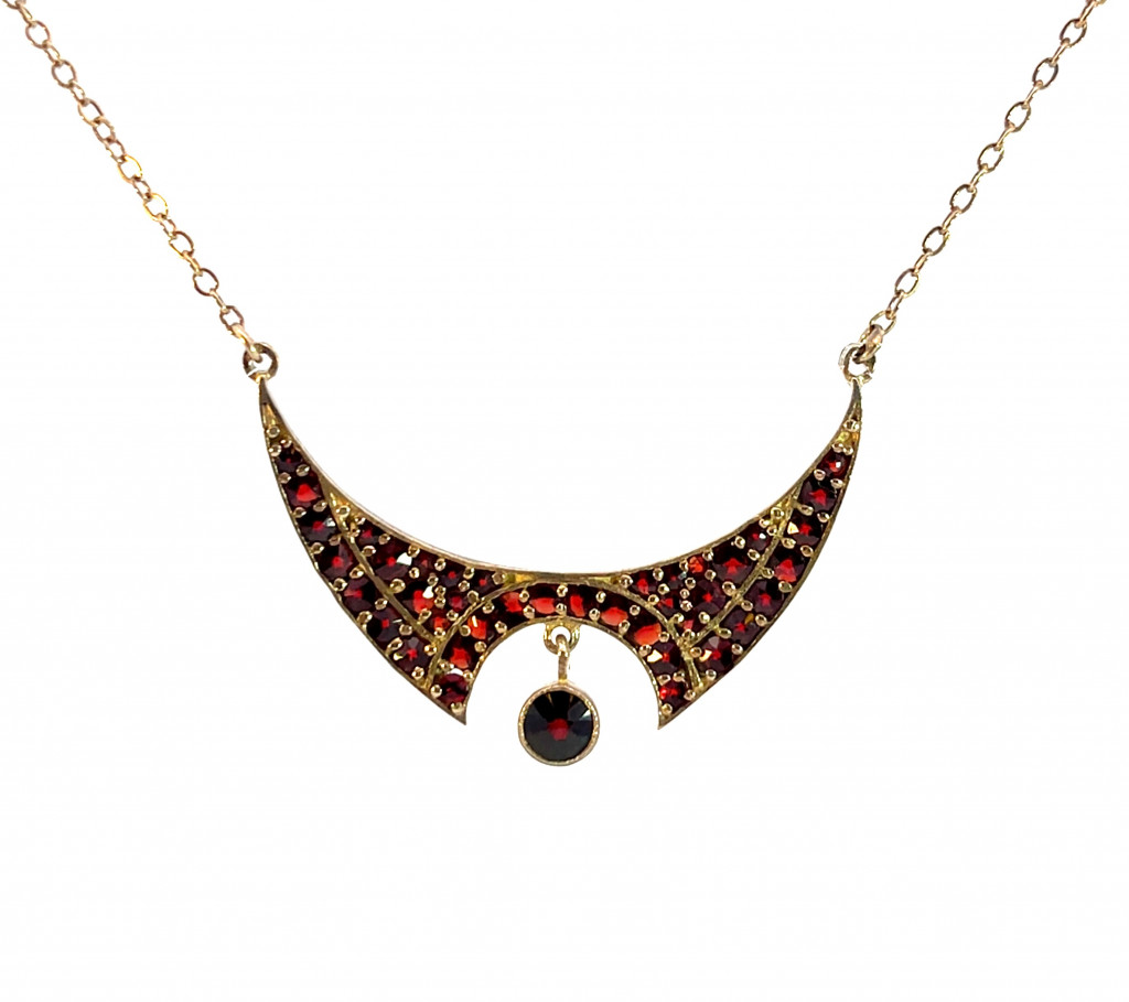 Výjimečný kolier vykládaný českými granáty ze stříbra o ryzosti 900/1000 s puncem zajíc. Celková váha je 5,75 g. Délka řetízku je 44 cm. Rozměry ozdoby jsou 13 x 40 mm. Značeno puncem G potvrzujícím pravost kamenů.