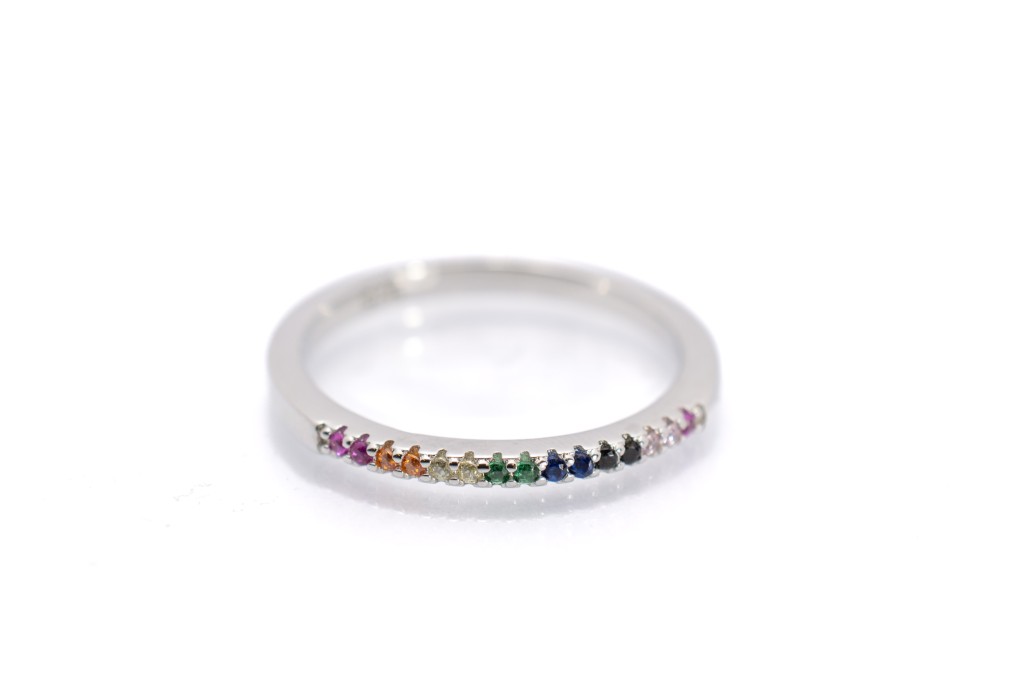 Stříbrný prsten s barevnými kamínky, ryzost 925/1000, váha 2,26 g, v nejširším bodě 2 mm. K dispozici ve velikostech 51, 52, 53, 57, 58, 59, 61.
