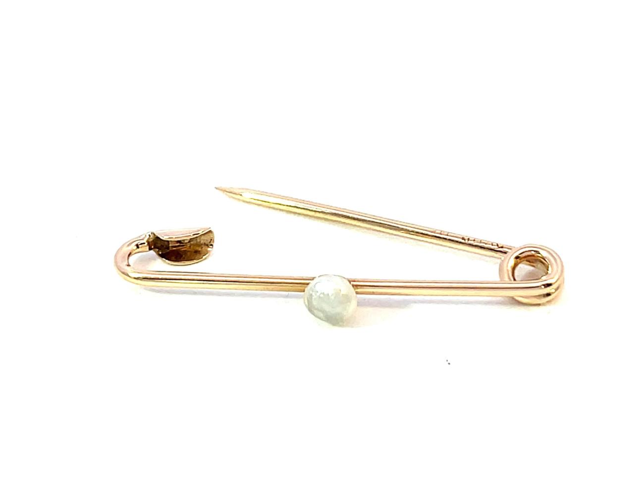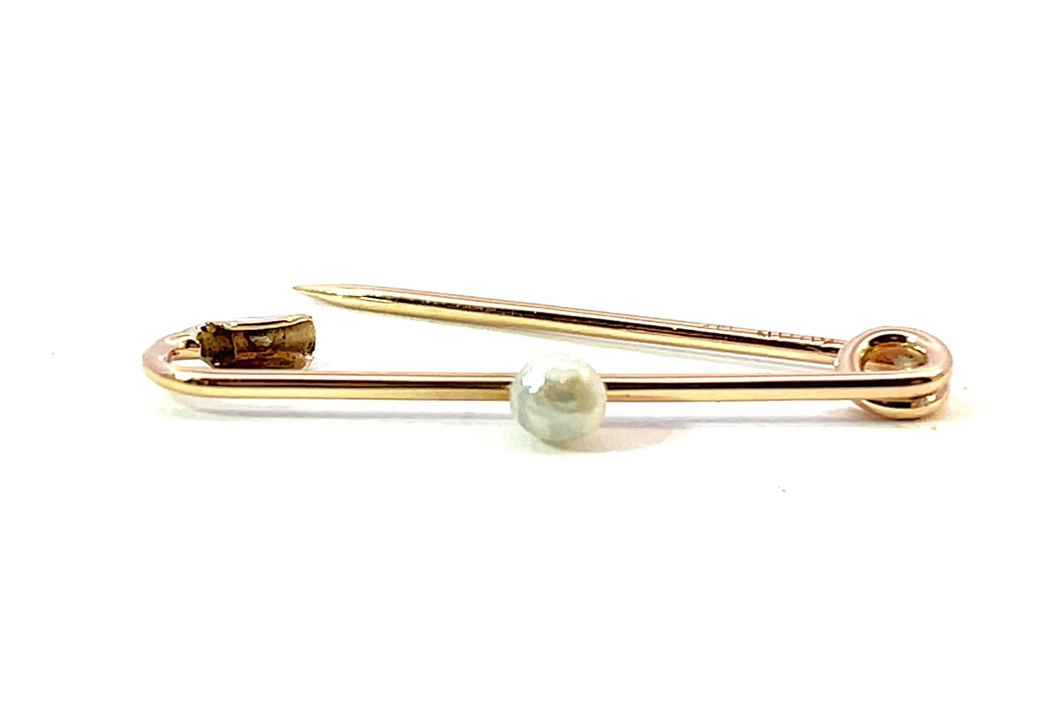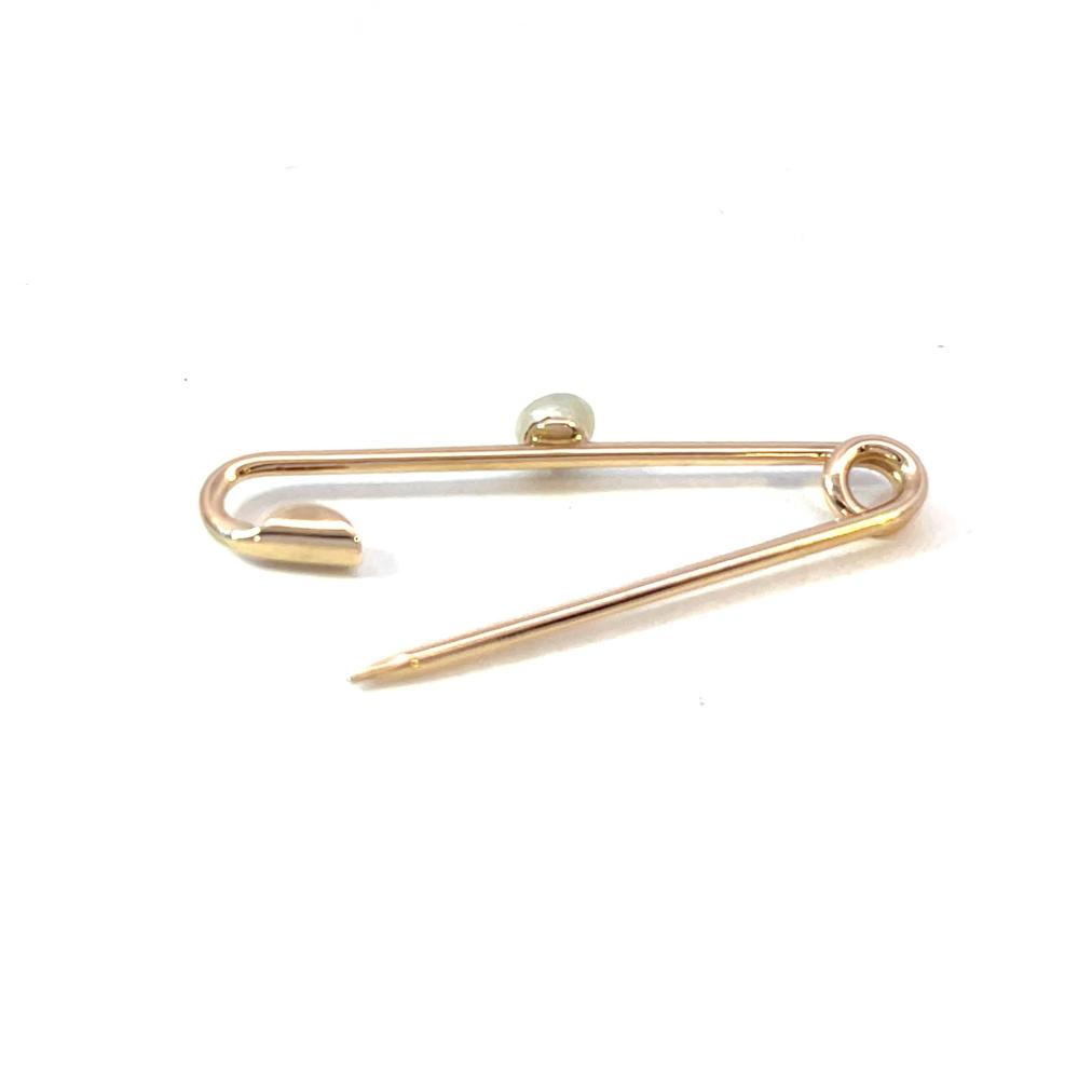 Zlatá brož o ryzosti 585/1000, punc labuť. Váha 1,46 g, délka 34 mm, průměr perly 4 mm.