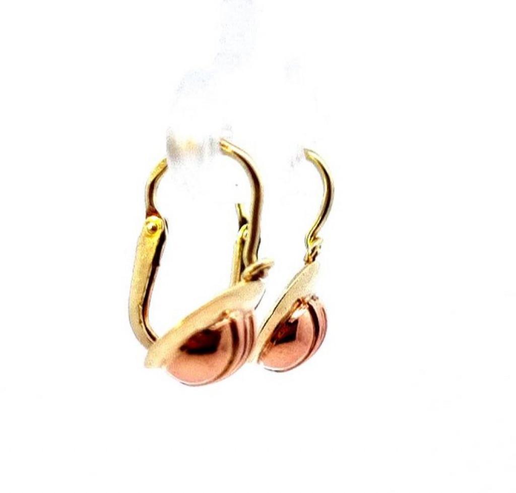 Náušnice z kombinace žlutého a růžového zlata o ryzosti 585/1000, punc čejka. Váha 1,76 g, výška 14 mm, v nejširším bodě 9 mm.
