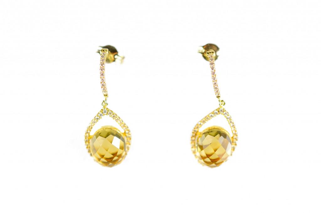 Krásné zlaté náušnice s broušenými citríny, osázené diamanty. Ryzost 750/1000 s puncem kohouta. Váha 5,59 g, celková délka 30 mm. V nejširším bodě měří 12 mm. Citríny mají rozměry 8 x 11 mm. Diamanty mají každý cca 0,01 ct. Dohromady mají diamanty cca 0,88 ct.