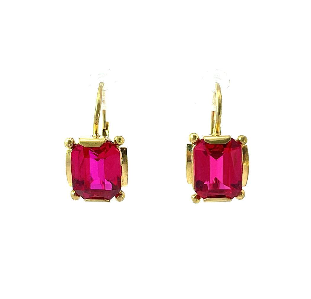 Zlaté náušnice o ryzosti 585/1000, punc čejka. Váha 3,09 g, výška 17 mm, v nejširším bodě 9 mm. Kameny jsou syntetické.