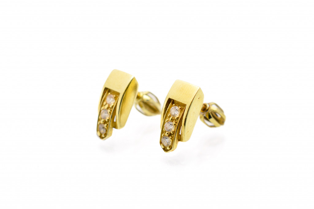 Zlaté náušnice šroubovací o ryzosti 585/1000 s puncem labuť. Váží 3,00 g. Délka 13 mm, šířka 5 mm. Celkem 6 ks zirkonů o průměru 2 mm. Kameny jsou syntetické.