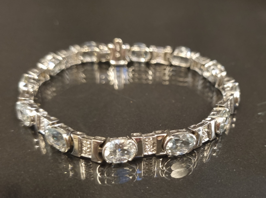 Náramek z bílého zlata o ryzosti 750/1000, punc kohout. Váha 20,26 g, délka 18,5 cm, v nejširším bodě 6 mm. Kámen - přírodní akvamarín - celkem 12 ks, dohromady cca 13,2 ct. Kámen - přírodní diamant briliantového brusu - celkem 24 ks, cca 0,008 ct každý - dohromady cca 0,19 ct. K náramku je znalecký posudek od gemmologa.