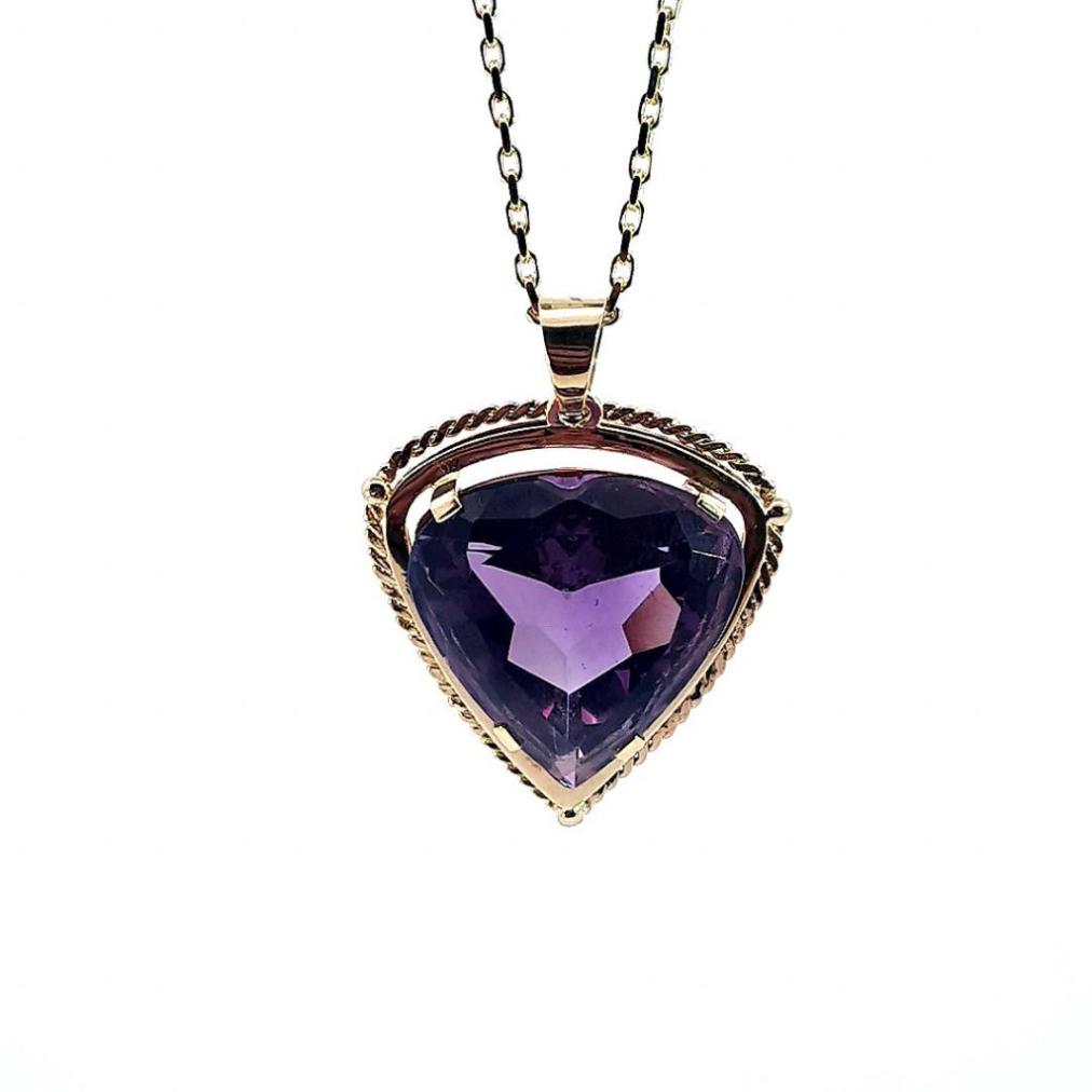Zlatý přívěs s velkým fialovým kamenem ve tvaru srdce. Ryzost zlata 585/1000 s puncem labuť. Celková váha je 12,49 g. Rozměry jsou 40 mm celková délka, 30 mm šířka. Rozměry kamene jsou: 23 mm na délku a 23 mm na šířku. Kámen je syntetický.