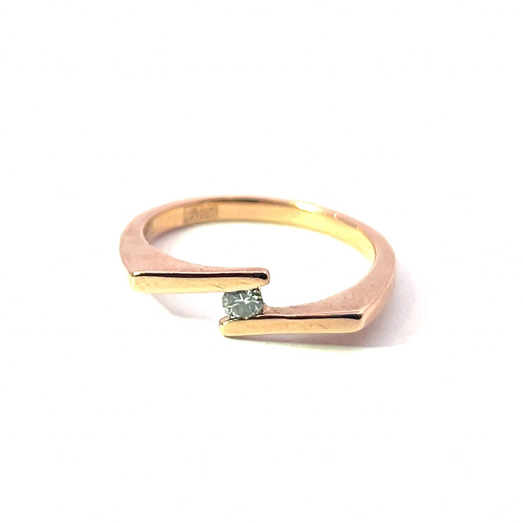 Prsten z růžového zlata o ryzosti 585/1000, punc labuť. Velikost 52, váha 2,61 g, v nejširším bodě 5 mm. Kámen - přírodní diamant briliantového brusu - 1 ks, cca 0,07 ct.