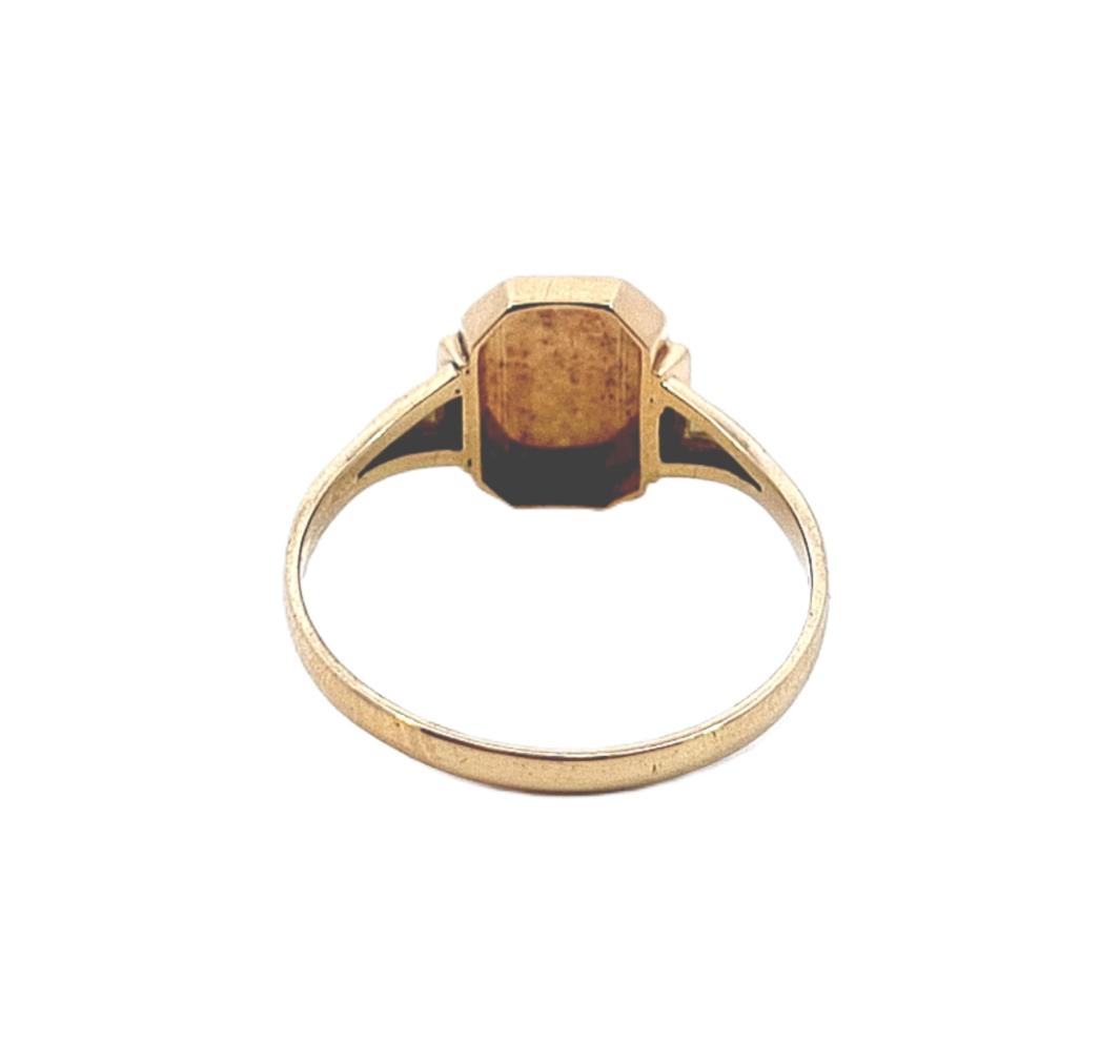 Zlatý prsten se zdobným monogramem. Ryzost zlata je 585/1000 s puncem labuť.  Velikost 56, váha 2,91 g. Rozměry hlavy prstenu jsou 12 x 11 mm. Šířka šíny je 2 mm.