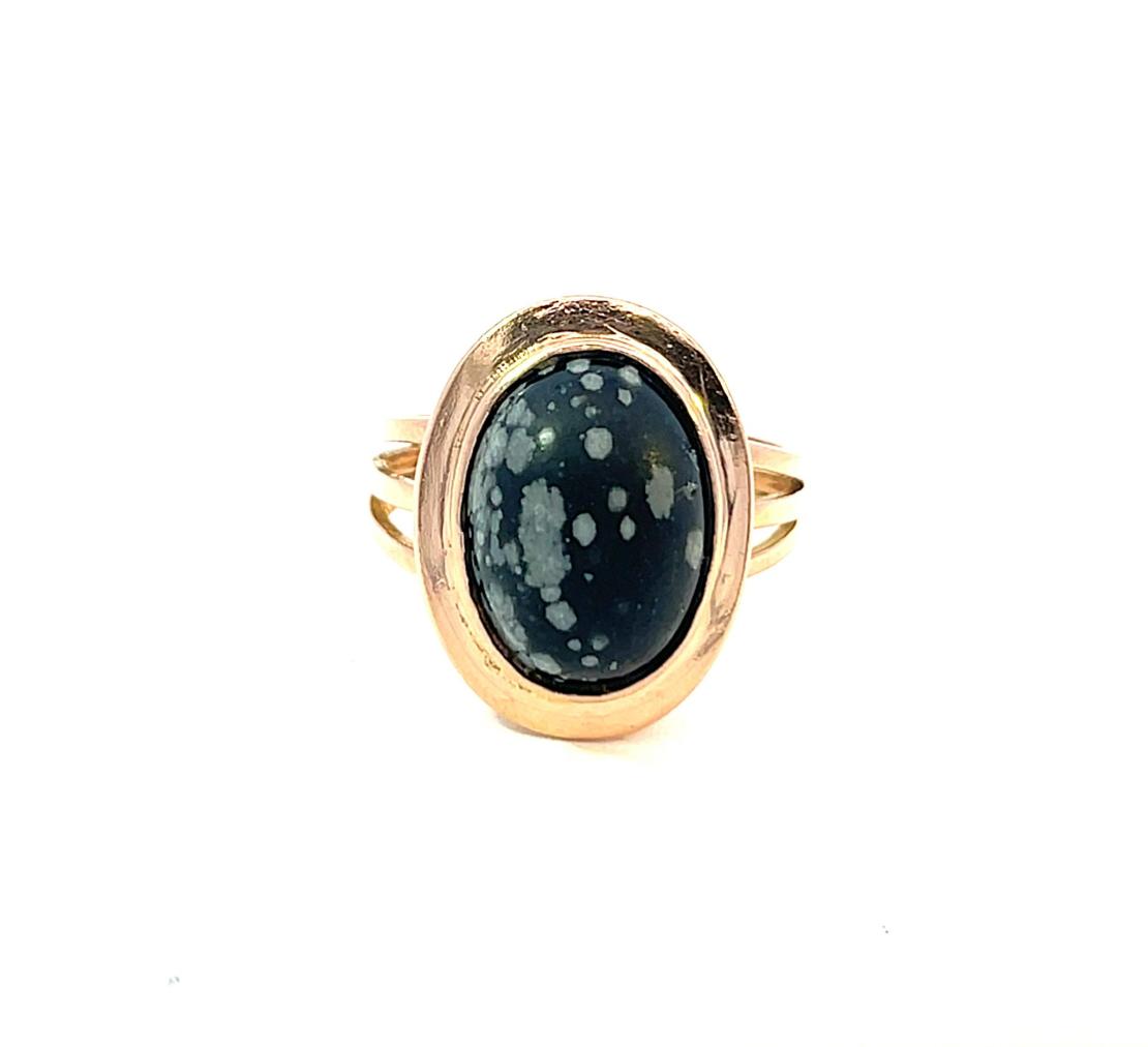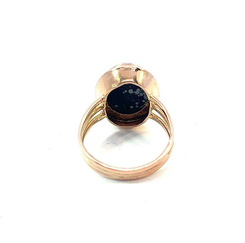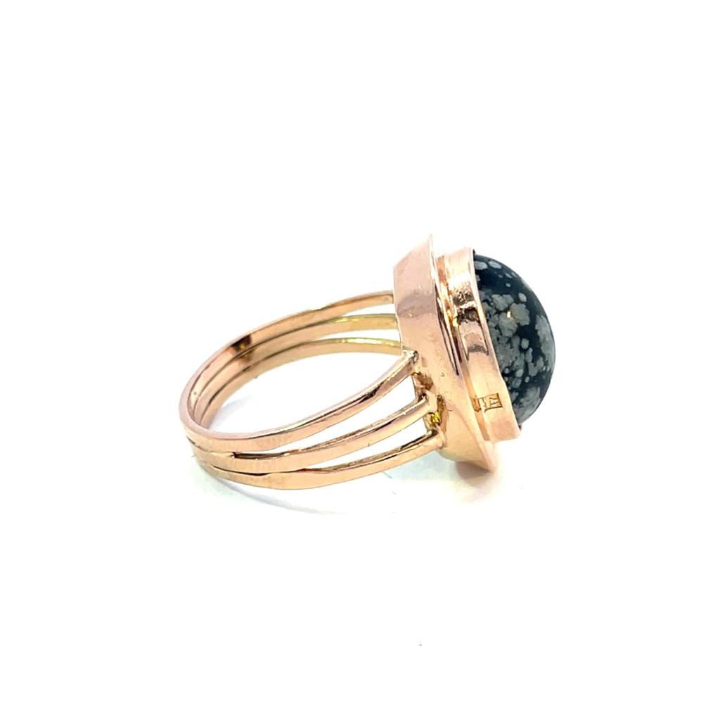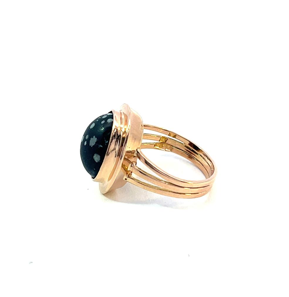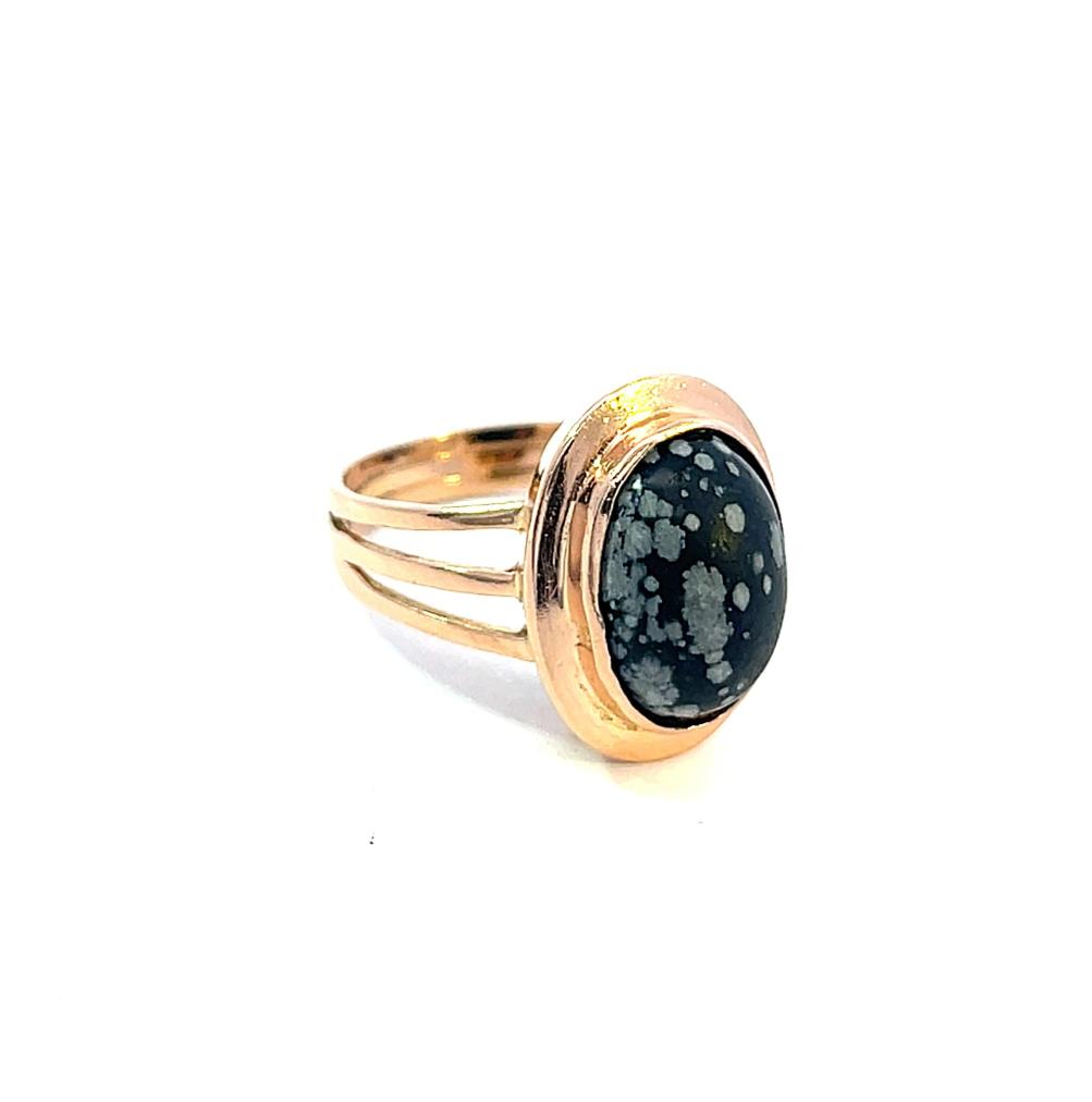 Prsten z růžového zlata o ryzosti 520/1000, punc Z se sluncem. Velikost 55, váha 4,96 g, rozměr hlavy prstenu 19 x 14 mm. Kámen je přírodní vločkový obsidián.