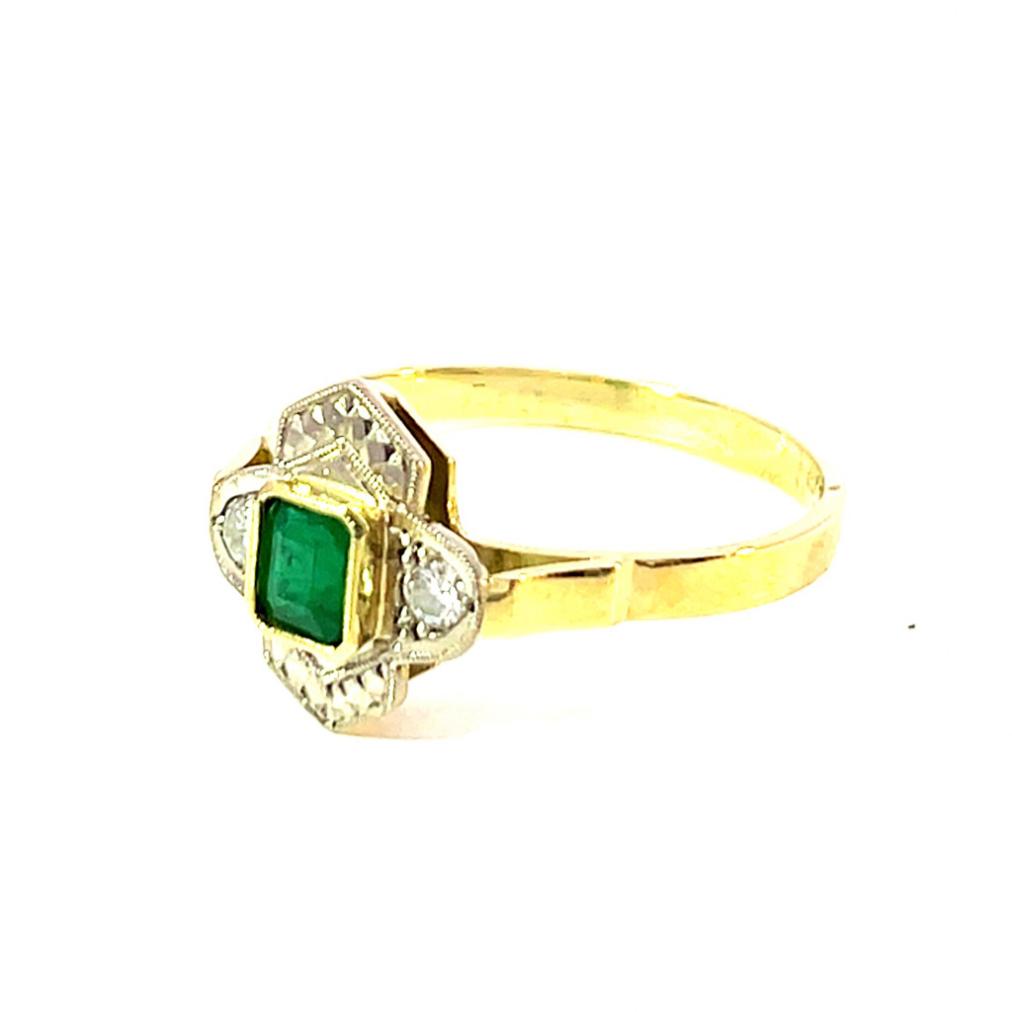 Prsten z kombinace žlutého a bílého zlata o ryzosti 585/1000, punc labuť. Velikost 57,5, váha 2,91 g, rozměr hlavy prstenu 12 x 11 mm. Kámen - přírodní smaragd - 1 ks. Kámen - přírodní diamant briliantového brusu - 2 ks, cca 0,07 ct každý - dohromady cca 0,14 ct.