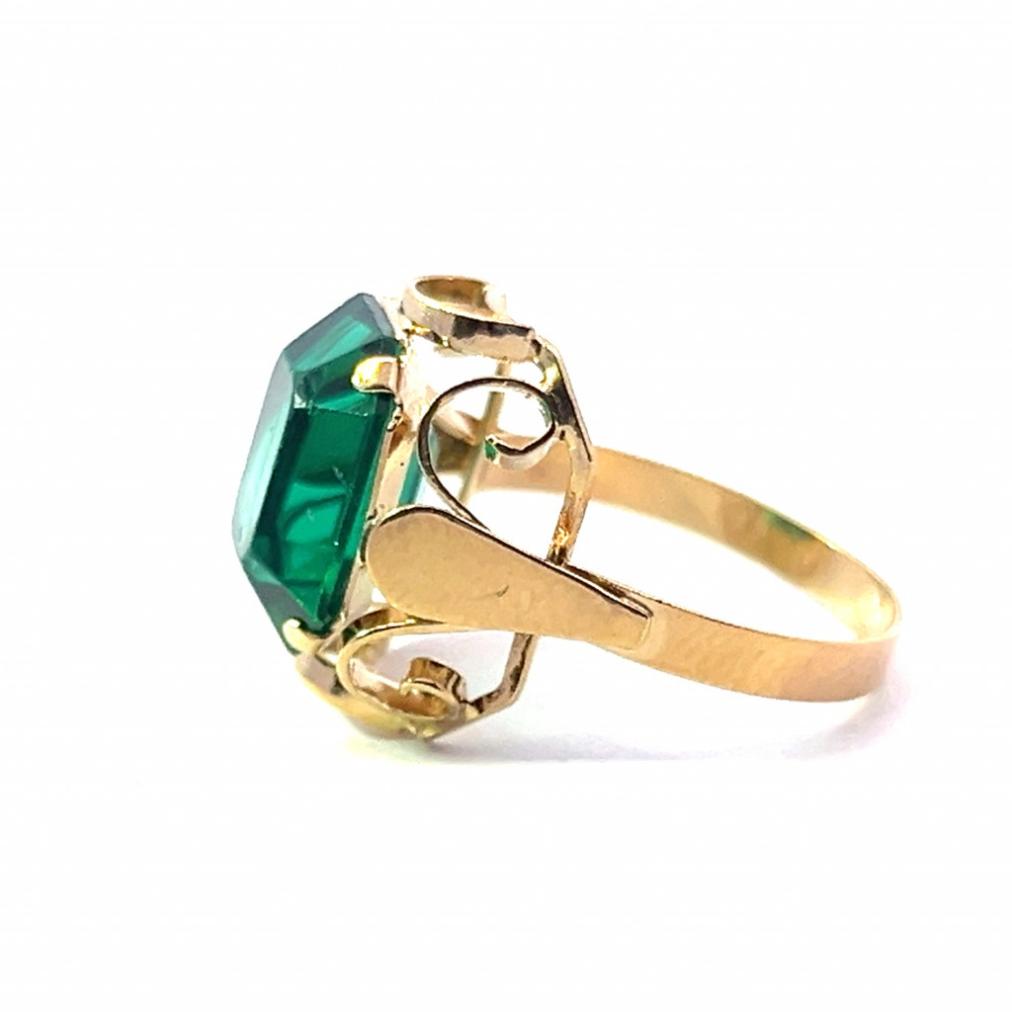 Zlatý prsten s krásným zeleným kamenem. Zlato o ryzosti 585/1000 s puncem labuť. Váha 2,85 g, velikost 53. Rozměry kamene jsou 12 x 10 mm. Rozměry hlavy prstenu jsou 12 x 15 mm. Kámen je syntetický.
