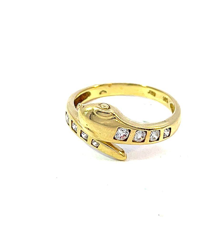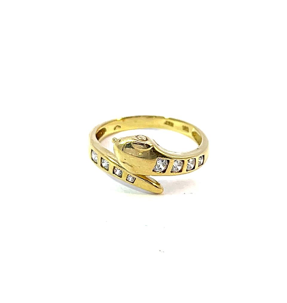 Zlatý prsten o ryzosti 585/1000, punc labuť. Velikost prstenu je 53, váha 2,98 g, v nejširším bodě má 9 mm. Kameny jsou syntetické.