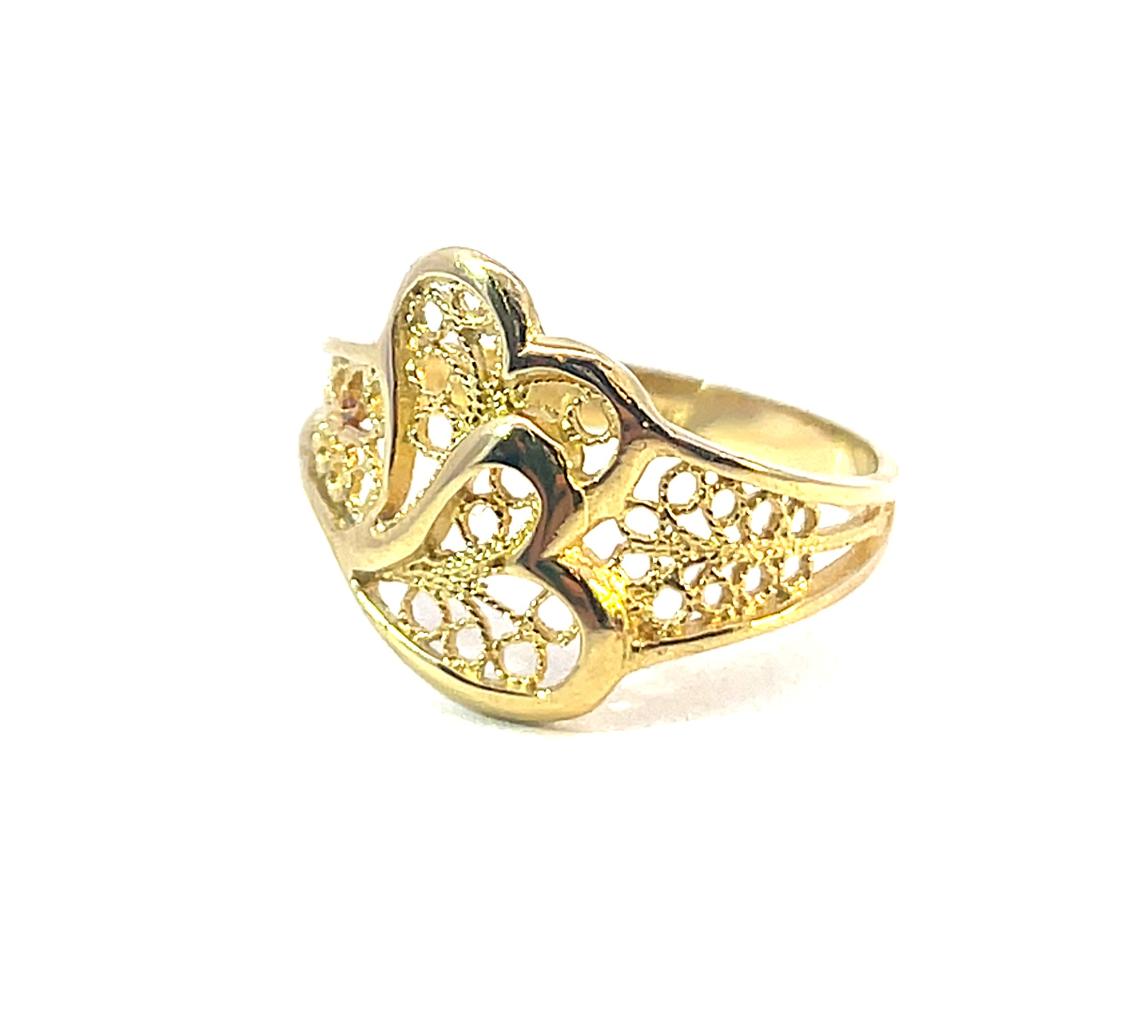 Zlatý prsten o ryzosti 585/1000, punc labuť. Velikost 53, váha 1,85 g, v nejširším bodě 14 mm.